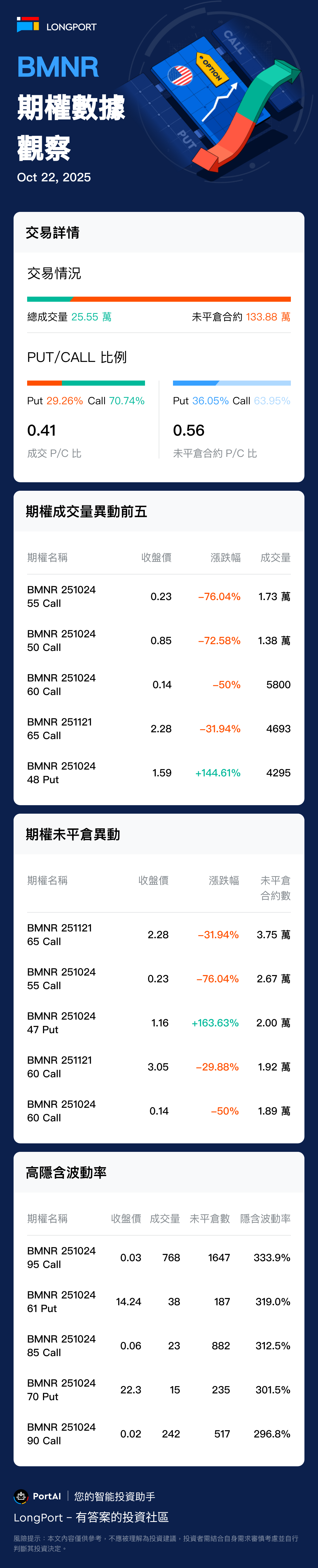 美東時間 2025-10-22,Bitmine Immersion Technologies, Inc.期權總成交 234092 張,看漲期權佔比 67%,看跌期權佔比 32%。