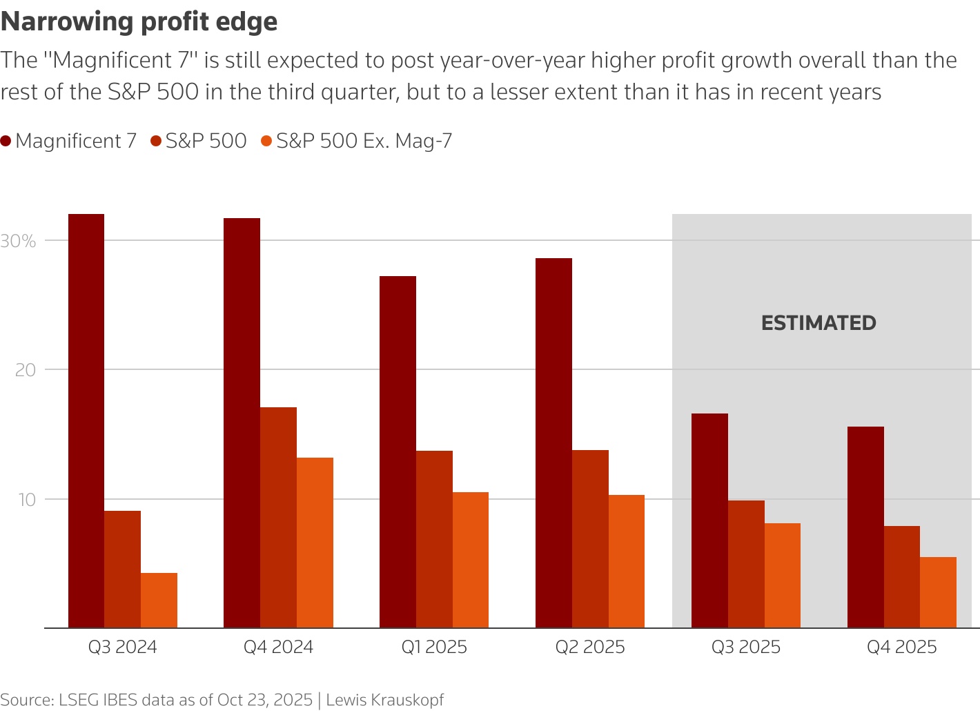 它們的利潤優勢正在縮小,但七大巨頭仍預計在本期內發佈更強勁的業績。根據 LSEG 的高級研究分析師塔金德·迪倫本週的數據,該集團的盈利預計將增長 16.6%,而其他公司的增長預計為 8.1%。