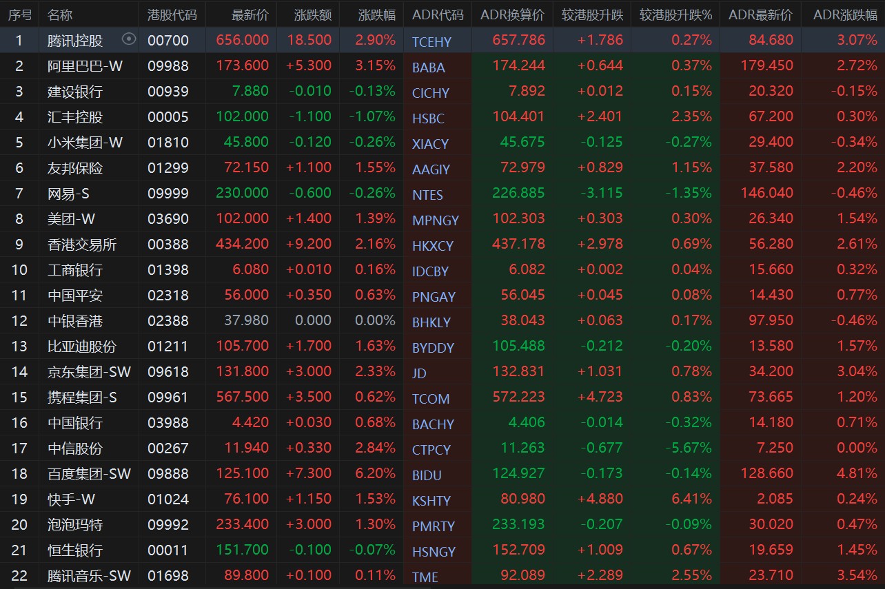 週一,美股三大指數集體收漲。恒生指數 ADR 上漲,按比例計算,收報 26523.81 點,較香港收市升 90.11 或 0.34%。大型藍籌股多數上漲,滙豐控股收報 104.401 港元,較香港收市漲 2.35%;騰訊控股收報 657.786 港元,較香港收市漲 0.27%。