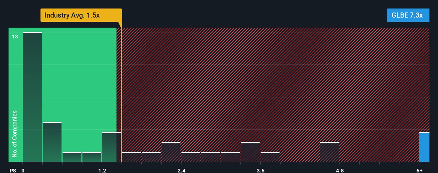 從另一個角度看,Global-E Online 的市銷率為 7.1 倍,遠高於美國多線零售行業的平均水平 1.6 倍及其同行的 2.2 倍。這也遠高於估計的公允比率 2.4 倍。如此高的溢價表明投資者寄希望於非常強勁的未來增長,但這也意味着如果結果令人失望,風險會更大。這些樂觀的數字能否經受住情緒變化的考驗?