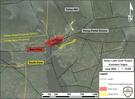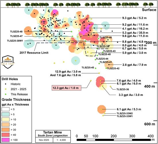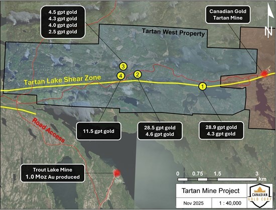 曼尼托巴省弗林弗隆 --(Newsfile Corp. -2025 年 11 月 27 日)- 加拿大黃金公司(TSXV: CGC)("加拿大黃金"或"公司")很高興地宣佈其在 100% 擁有的塔坦礦(Tartan Mine)進行的第四階段鑽探計劃的持續結果,位於曼尼托巴省弗林弗隆附近。特別是在主礦區的西側,令人鼓舞的結果繼續支持向潛在礦山重啓的計劃。亮點包括 12.3 克/噸 黃金 在 14.0 米 內, 8.2 克/噸黃金在 9.9 米內,和 10.7 克/噸 黃金 在 4.5 米內。 加拿大黃金目前正在被 McEwen Inc.(NYSE: MUX)(TSX: MUX)收購,預計將在 2026 年初完成交易。