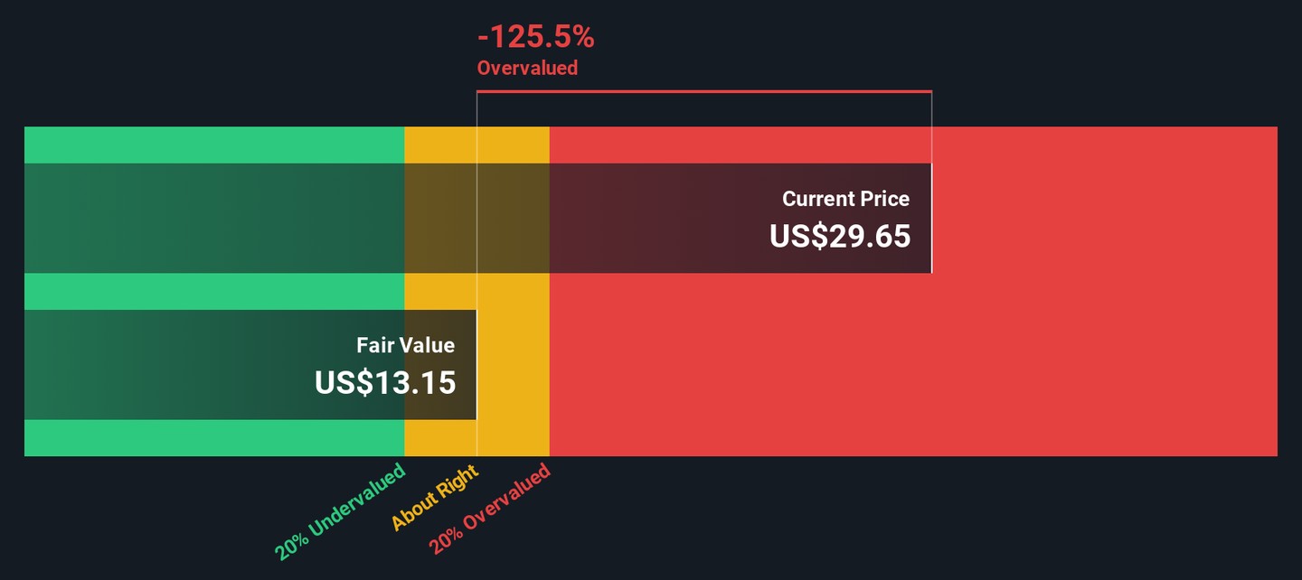 While the earnings multiple makes Cardinal look cheap, our DCF model points the other way. It puts fair value at about $13.15 a share, well below the current $29.65 price, suggesting the stock could be overvalued if cash flows disappoint. Which signal do you trust more?