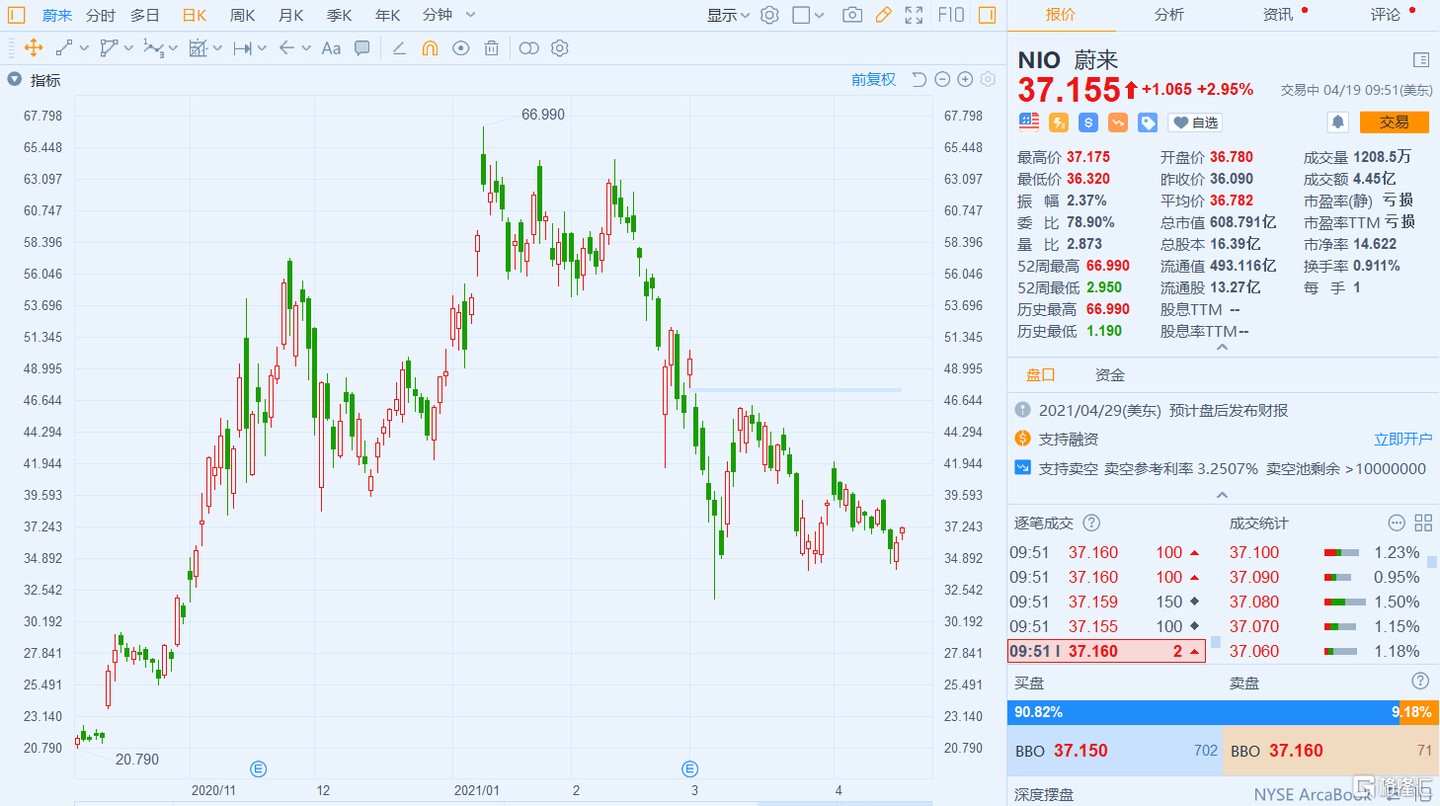 蔚來 (NIO.US) 今日股價走高,現漲幅為 2.95%,報 37.155 美元,暫成交 4.45 億美元,最新總市值為 608.791 億美元。在 2021 上海車展現場會上,蔚來 CEO 李斌表示,ET7 的生產製造及測試工作正緊鑼密鼓的展開。截至目前,蔚來已在全國累計部署 203 座換電站,144 座超充站,近 1100 根超充樁,超過 1800 根目的地充電樁,並且接入了超過 38 萬根第三方快充樁。此外,蔚來今日發佈 “Power North 計劃”,該計劃是針對北方八省的基建規劃以及充電優惠政策:未來 3 年內,在北方八省計劃實現 100 座換電站、120 輛移動充電車、500 座超充站,超 2000 根超充樁、超 10000 根目的地充電樁的資源佈局。