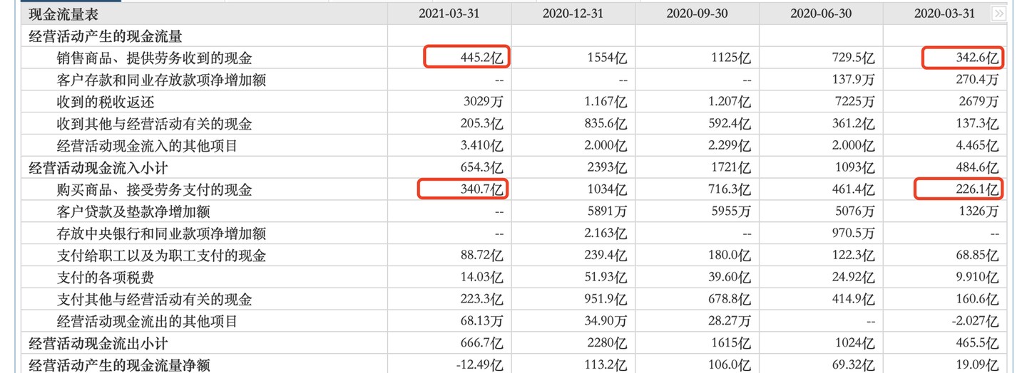 但查看現金流表,購買商品、接受勞務支付的現金支出過快增長,才是導致這 “-12 億” 經營活動現金流淨額的原因。