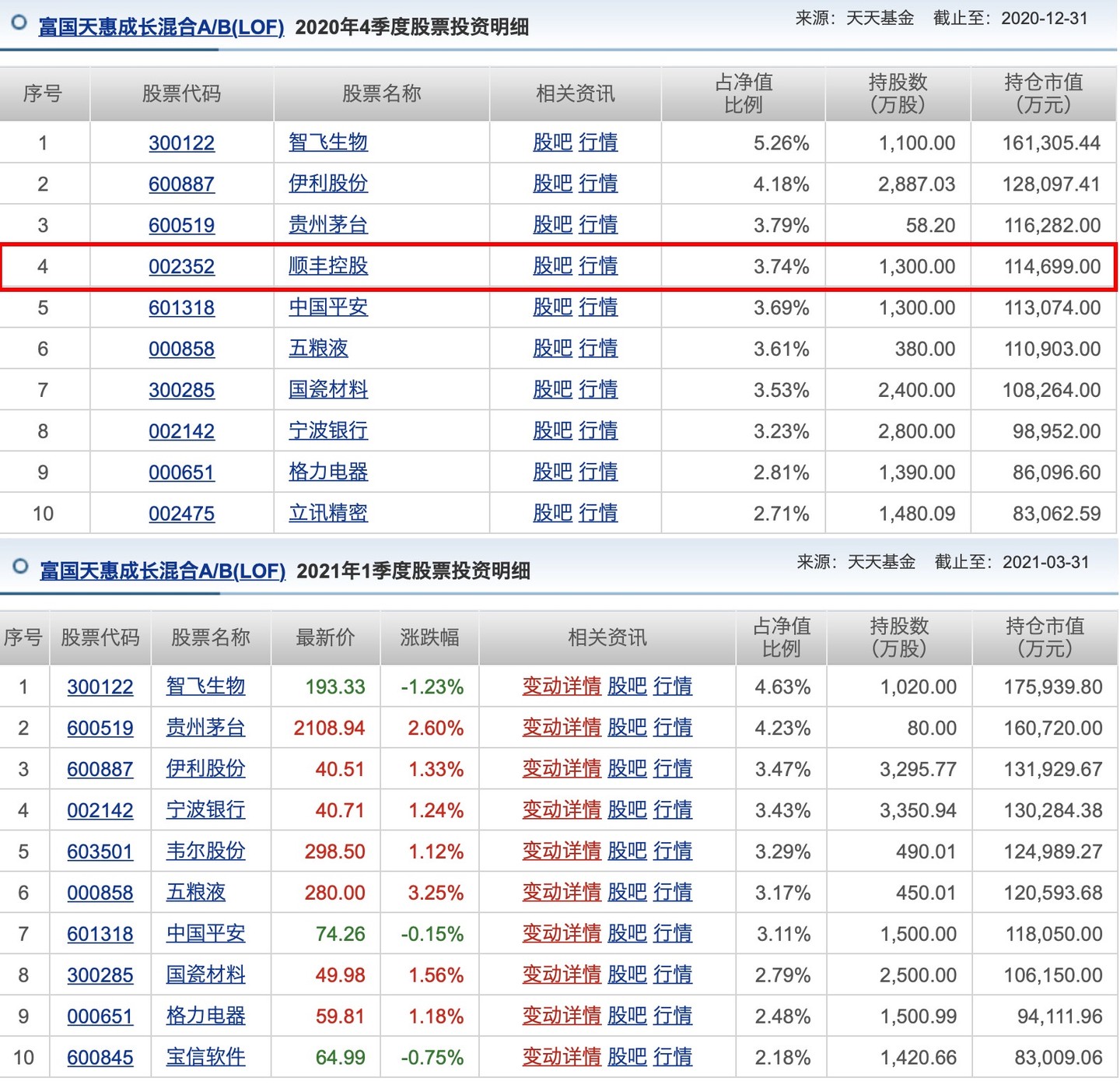 拿富國天惠來説,此前朱少醒一直持有 1300 萬股順豐,倉位一度達到 4.37%,但一季度順豐跌出前十重倉,意味着他對順豐的配置至少降到了基金淨值的 2.18% 以下,