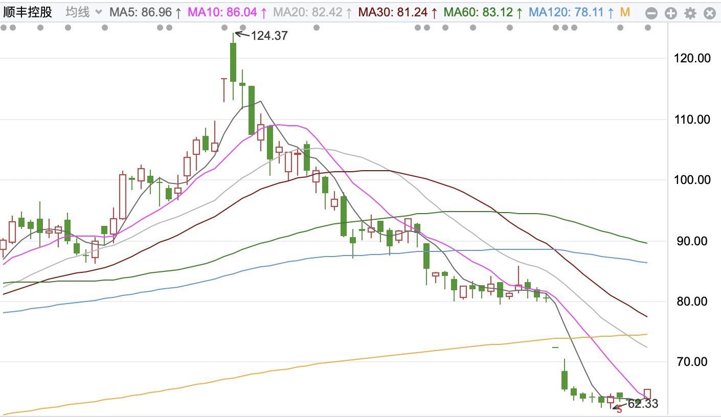 2020 年開年,作為 “茅股” 一員的順豐,下跌尤為慘烈。從最高點 124.37 元跌至期間最低點 62.33 元,整整下跌了 50%!
