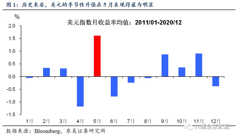 对市场而言,尽管全球股市很可能因上述鹰派言论以及 “Sell in May” 出现回调,但同样不可忽视的是美元的升值风险,如图 1 所示,美元指数往往在 5 月季节性走强,这对于全球的资金流动和资产配置都将产生一定的影响。