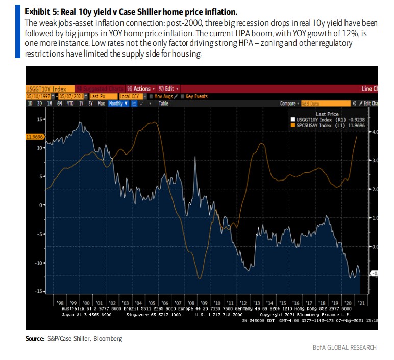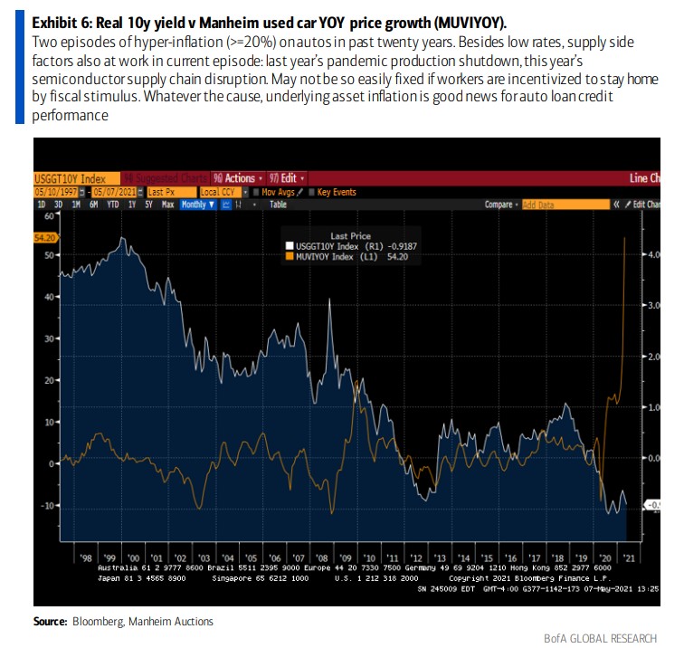 但是,最值得關注的重要現象在於,在此之後,美國實際收益率越來越低,資產通脹的情況也越來越嚴重,房價和汽車價格都出現了通脹——前者最新數據顯示同比增長 12%,後者年增長率基本大於等於 20%,最新數據甚至高達 52%,為惡性通脹。