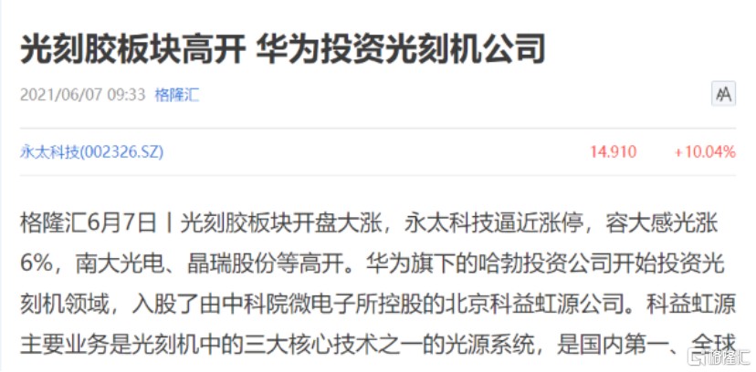 6 月 7 日,華為旗下的哈勃投資公司開始投資光刻機領域,入股了由中科院微電子所控股的北京科益虹源公司。科益虹源主要業務是光刻機中的三大核心技術之一的光源系統,是國內第一、全球第三的 193nm ArF 準分子激光器企業。天風證券表示,我國低端光刻膠領域基本實現國產化,但是在芯片用 EUV 等中高端產品上,仍處於起步階段,與日本企業有較大差距。光刻膠的崛起有望帶動國產光刻機的進步,實現協同發展。