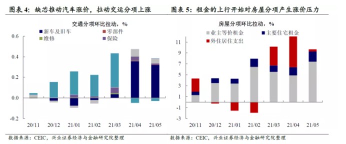 如果将本次通胀大涨分拆来看的话,可以看到交运和住房分项对 CPI 的环比贡献持续上升。其中交运中又以汽车价格上行贡献了主要涨幅,这体现了缺芯的影响仍在持续;另一方面住房分项又以租金为代表,体现了劳动力回流大城市工作的影响。这些现象短期内恐难以消退。