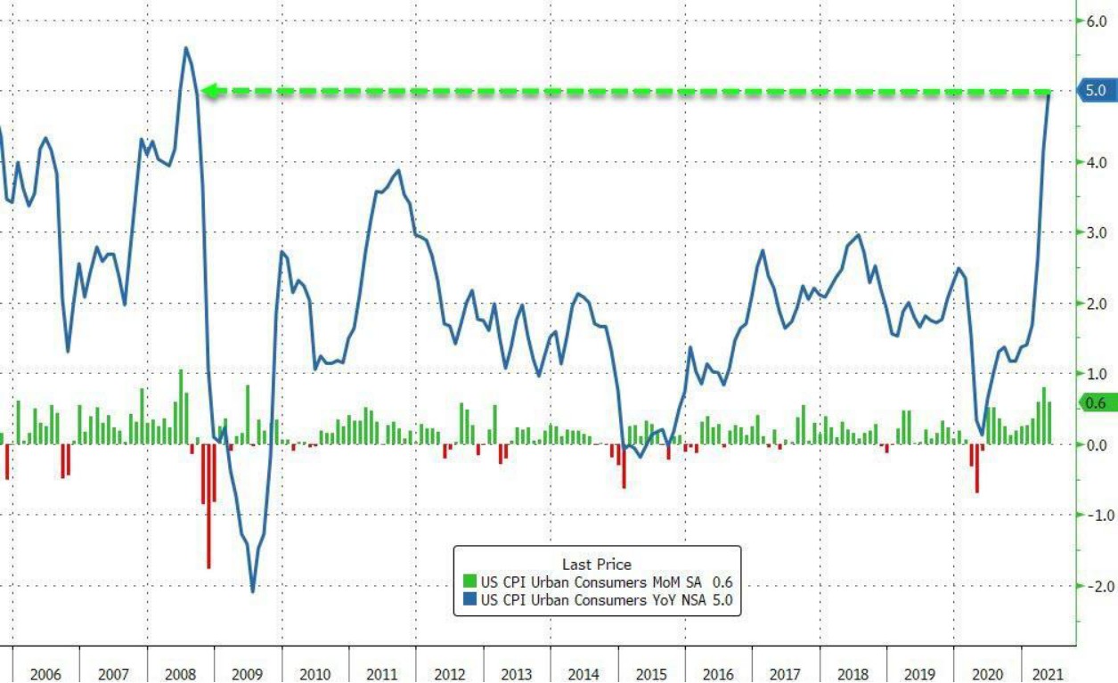 华尔街见闻此前报道,美国五月 CPI 同比大涨 5%,预期值仅为 4.7%,增速创下 2008 年 8 月以来最高值,扣除食品和能源的核心 CPI 同比增长 3.8%,增速创下 1992 年以来的新高。