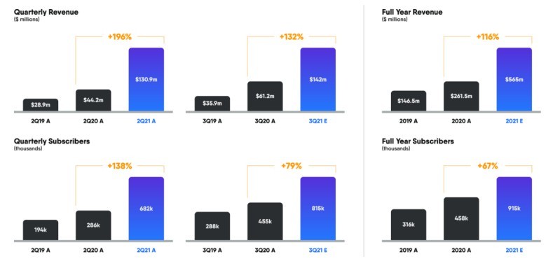 展望未來,該公司預計 2021 年 Q3 營收在 1.40 億-1.44 億美元之間,按中點計算同比增長 132%,預計用户數量將達 81-82 萬之間,按中點計算同比增長 79%;預計 2021 年全年營收將在 5.60 億-5.70 億美元之間,按中點計算同比增長 116%,截止年末用户數量將達 91-92 萬之間,按中點計算同比增長 67%。