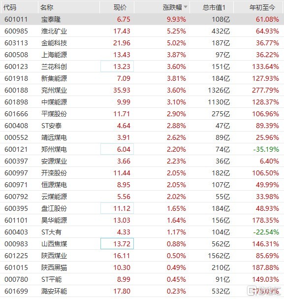 煤炭板塊捲土重來,兗州煤業盤中漲超 6% 再創新高;寶泰隆漲停,淮北礦業、金能科技漲超 5%,上海能源、蘭花科創、新集能源、中煤能源等跟隨上漲。近期煤炭價格大漲,相關保供穩價政策措施也陸續出台。在 9 月 16 日國家發改委召開的新聞發佈會上,國家發改委新聞發言人孟瑋表示,要推動煤炭中長期合同對發電供熱企業直保並全覆蓋,將發電供熱企業中長期合同佔年度用煤量的比重提高到 100%。13 家大型煤炭企業承諾,將積極挖潛增產,全力保障煤炭安全穩定供應。