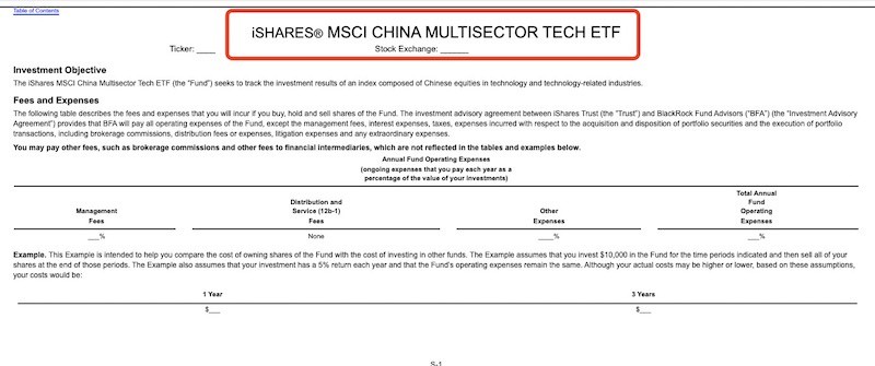 根据美国证监会(SEC)网站的备案信息,全球最大资管机构、最大 ETF 发行方贝莱德(BlackRock)已提交安硕 MSCI 中国多行业科技 ETF(iShares MSCI China Multisector Tech ETF)的发行说明书。