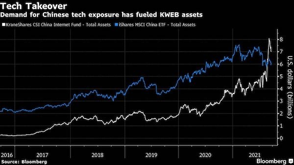 8 月,KWEB 更是超过贝莱德 61 亿美元规模的安硕 MSCI 中国 ETF (MCHI),一举成为美国最大的中国主题 ETF。在近期多个经济领域监管政策落地后,KWEB 一度暴跌 58%。尽管如此,现金还是在逢低买入。贝莱德在美国已经有近 400 只各类主题的 ETF,但这个 ETF 领头羊今年推出 ETF 的频率有所下降。据彭博数据,今年迄今,只有 7 只贝莱德安硕 ETF 上市。相比之下,去年全年有 30 多只,2019 年有 16 只。