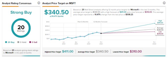 在擁有眾多華爾街明星分析師的 TipRanks 評級網站上,微軟獲得了 “強烈買入” 的共識評級,平均目標價為 340.50 美元。