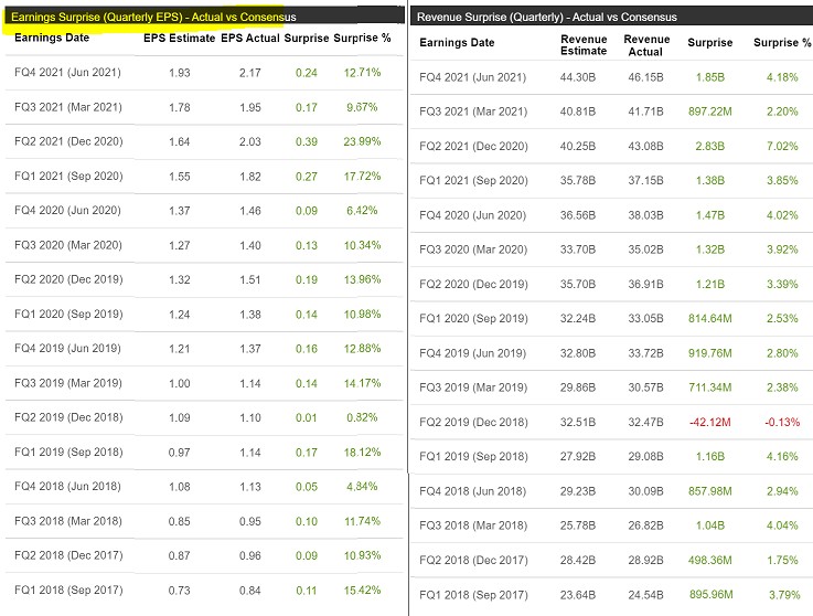 自 2017 財年 Q3 以來,微軟實際業績表現幾乎都超出市場普遍預期,並且在多數時間段超出普遍預期 10% 以上,這點也使得投資者和分析師在每個季度公佈業績前,只要金融市場沒有出現大規模黑天鵝事件,都對微軟的業績持非常樂觀的態度。