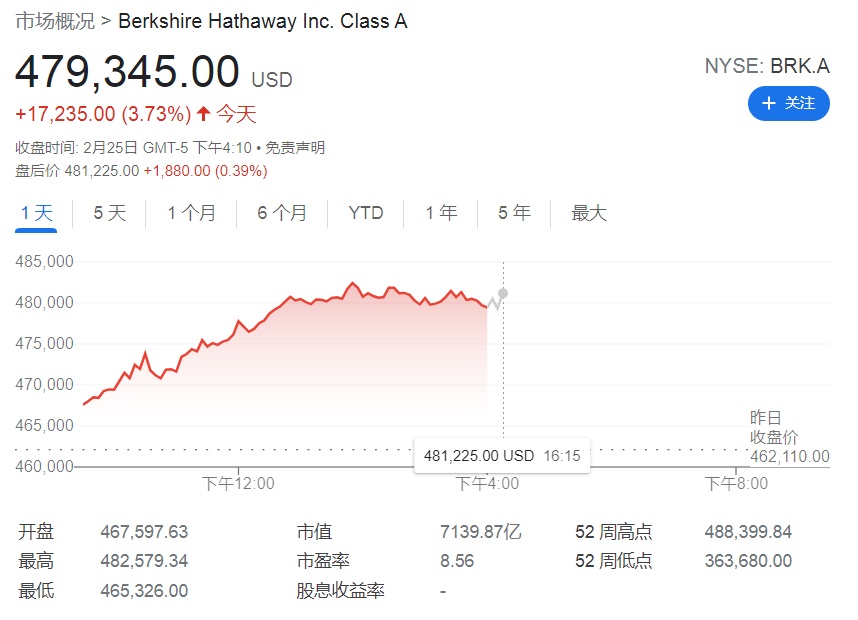 截至周五美股收盘,伯克希尔收涨 3.73% 报 479,345 美元,年初至今 5.51% 的累计涨幅稳稳跑赢同期三大指数,以约7150 亿的市值成为全球第七大最高市值公司,而年初至今,91 岁的巴菲特也是资产唯一正向增长的全球前 10 大富豪。