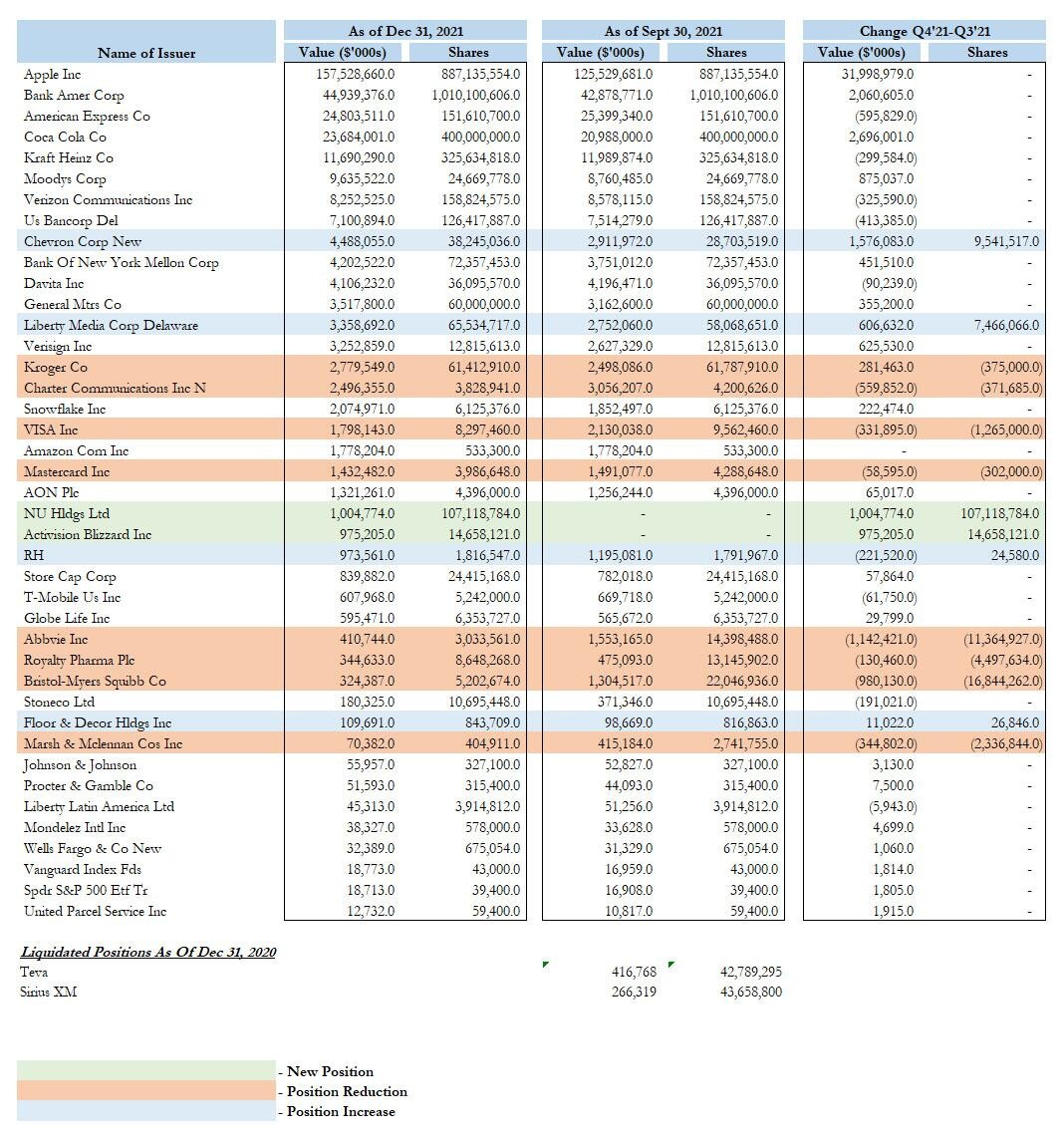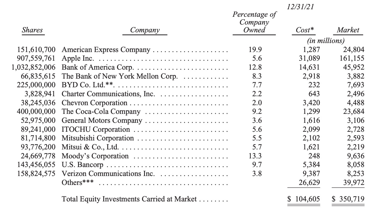 截至去年底,伯克希尔持股苹果(市值 1611.55 亿美元)、美国银行(市值 459.52 亿美元)、美国运通(市值 248.04 亿美元)、可口可乐(市值 236.84 亿美元)、穆迪(市值 96.36 亿美元)、威瑞森(市值 82.53 亿美元)、美国合众银行(市值 80.58 亿美元)、比亚迪(市值 76.93 亿美元)、雪佛龙(市值 44.88 亿美元)、纽约梅隆银行(市值 38.82 亿美元)、伊藤忠商事株式会社(市值 27.28 亿美元)、三菱商事株式会社(市值 25.93 亿美元)、Charter 通信(市值 24.96 亿美元)、三井集团(市值 22.19 亿美元)。