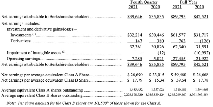 伯克希尔哈撒韦四季度核心财务指标亮眼,录得经营利润 72.85 亿美元,同比增 45%;净利润 396.5 亿美元,同比增 10.6%。2021 年全年净利润达 897.95 亿美元,同比增幅达 111%;公司年底现金储备为 1467.19 亿美元。此外,伯克希尔 2021 年投入 271 亿美元用于回购股票,达到 2018 年回购股票的最高年度水平。