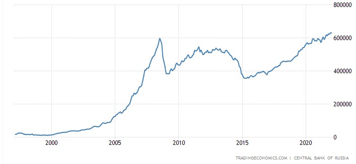 據統計,截至 2022 年 1 月 14 日,俄羅斯的外匯儲備總額達到 6302.07 億美金,為歷史最高。