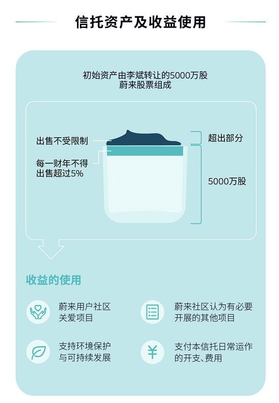 根據章程,信託資產初始為 5000 萬股,每一財政年度可出售不超過 5%,而超出 5000 萬股的部分出售則不受限制。蔚來目前尚未實現盈利,用户信託也拿不到分紅,因此收益只能來自出售股權。按照蔚來汽車目前價格 20.94 美元/股計算,這部分股票目前市值約為 10.47 億美元。