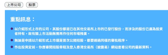根據要求,公司以介紹方式上市的,一般有幾個特點:1)申請以介紹形式上市的公司,上市的股份都是已發行股份;2)有關股份已具備條件在公開的市場進行交易,而有關上市活動亦無需再作任何市場推廣;3)公司不會發行新股,亦不會籌集新的資金。4)選擇介紹方式上市的公司一般股份已在另一家交易所上市或公司股份由一家交易所轉到另一家交易所上市。