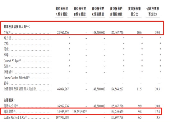股權架構方面,根據招股書,蔚來創始人、董事長、CEO 李斌持股 10.6%,擁有投票權 39%,騰訊持股 9.8%,擁有 17.4% 投票權。