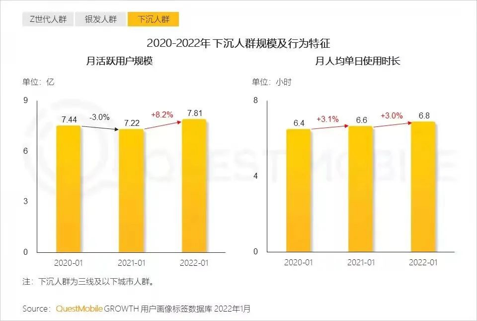 另外,來自於 QuestMobile 的最新調研數據也顯示,隨着我國城鎮化達到較高水平,下沉市場網絡用户規模雖然趨於穩定,但下沉市場的用户對於網絡使用的需求依然持續增長(主要體現於用户使用時長)。