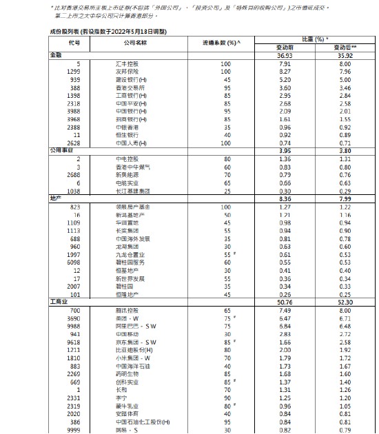 5 月 21 日消息,5 月 20 日,港股公佈季度檢討結果,相關變動 6 月 13 日生效,其中,滙豐控股、騰訊控股權重提升至 8%,美團權重上升,阿里巴巴、小米、友邦保險、港交所等權重下調。
