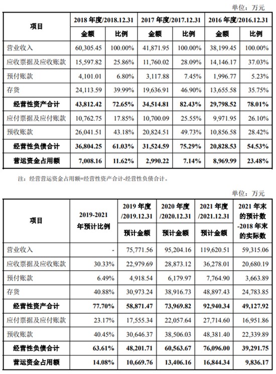 為此,錫裝股份還在申報稿中列出了測算表。測算表分為七步,第一步將營業收入、應收票據及應收賬款、預付賬款、存貨加總得出經營性資產;第二步將應付票據及應付賬款和預收賬款加總得出經營性負債;第三步將經營性資產減去經營性負債得出營運資金佔用額;第四步將營運資金佔用額除以當年營業收入得出比例,並取 2016 年至 2018 年的平均值;第五步按 2016 年至 2018 年營業收入的複合增長率,計算得出 2021 年的營業收入預計值;第六步用 2021 年的營業收入預計值乘以第四步算出的平均值,得出 2021 年預計營運資金佔用額;最後一步,用 2021 年預計營運資金佔用額減去 2018 年實際額。
