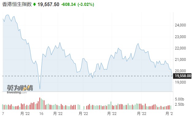 香港恒指跌幅擴大至 3%,恒生科技指數大跌超 4%。嗶哩嗶哩跌近 10%,小米、阿里健康跌超 6%,京東跌超 4%,阿里巴巴、網易跌超 3%,碧桂園跌超 6%,碧桂園服務跌超 9%。