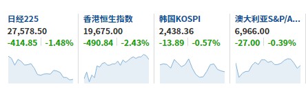 此外,早盤中,東京日經 225 指數跌近 1.5%,韓國 KOSPI 指數小幅跌 0.57%,澳大利亞 S&P/ASX200 指數微跌 0.39%。