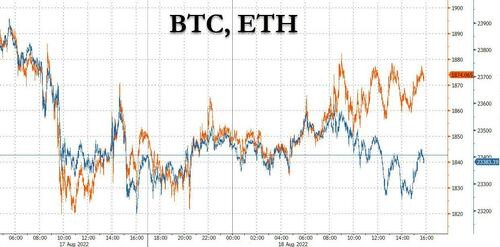 近期與股市、特別是科技股聯動緊密的主流加密數字貨幣最初普跌,隨着午盤後納指轉漲,加密貨幣也多數轉漲。市值最大的龍頭比特幣跌 1% 後小幅轉漲,重回 2.33 萬美元上方,市值第二大且網絡即將迎來重磅升級的以太坊漲幅擴大至 2%,交投 1870 美元。