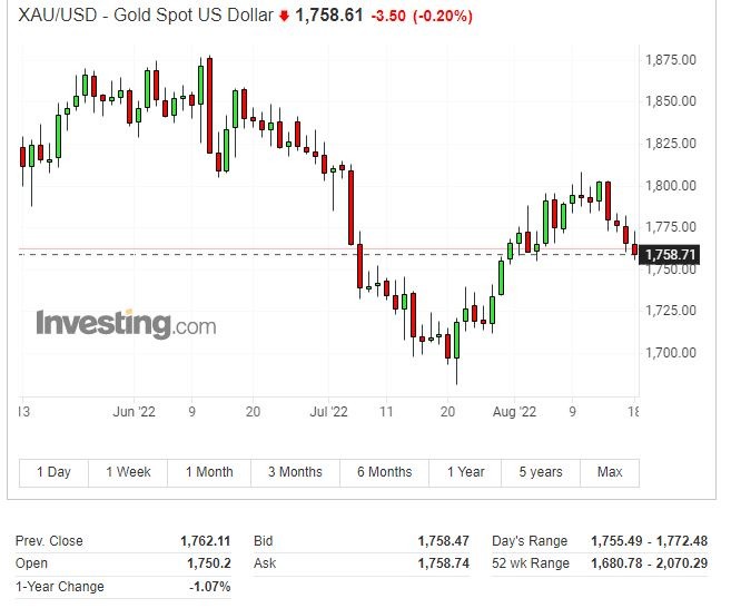 現貨黃金也止漲轉跌,從日高所致的 1770 美元上方回落,直接跌破 1760 美元整數位,日內最深跌 0.4%,從日高回落近 17 美元,接近抹去 7 月 29 日來全部漲幅,同樣連跌四日至三週低位。