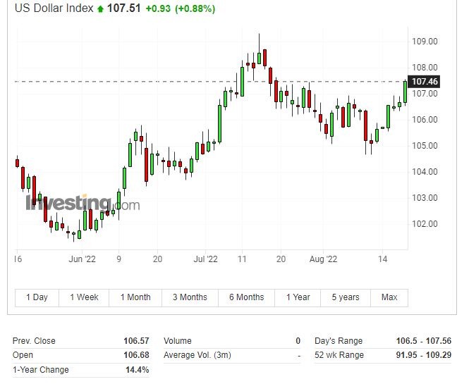 美聯儲對加息整體的鷹派姿態令美元指數上破 107 關口,衡量兑六種主要貨幣的一籃子美元指數 DXY 最高漲 0.9%,至 107.56,創 7 月 18 日以來的一個月新高。