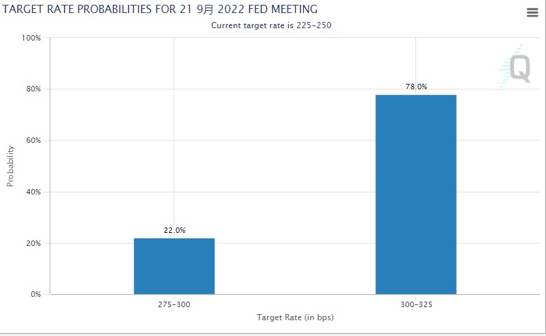 截止發稿,芝商所 FedWatch 工具顯示,當前市場預測美聯儲 9 月加息 75 個基點的概率為 78%,加息 50 基點的概率降至 222%。