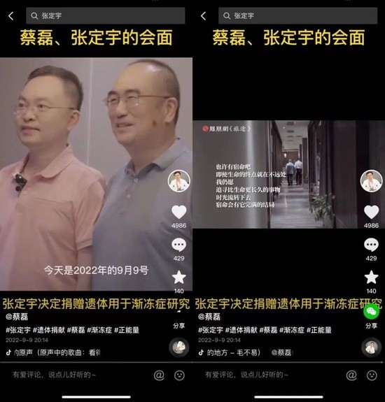 今年 9 月 9 日,他在抖音發佈了一則上月底和張定宇會面的視頻。當天,湖北省衞生健康委員會副主任,原武漢金銀潭醫院院長張定宇決定捐贈自己的遺體用於漸凍症研究。