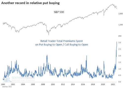 上週,散户購買了 199 億美元的看跌期權。他們只購買了 65 億美元的看漲期權。看跌期權為看漲期權 3 倍,為歷史上首次。