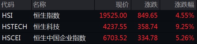 港股也迎來大爆發,恒生科技指數尾盤衝高,收漲 9.25%,恒指收漲 4.55%,國企指數收漲 5.26%。地產、互聯網醫療、科技股集體衝高,金融股漲幅居前。