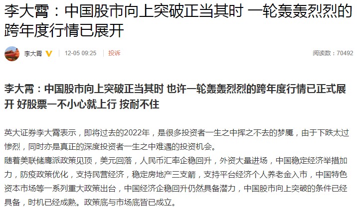 今天早上,財經網紅李大霄發文稱,中國股市向上突破正當其時,一輪轟轟烈烈跨年度行情或已展開。