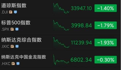 当地时间周一,美股三大指数收盘集体走低。道指跌 1.4%,标普 500 指数跌 1.79%,纳指跌 1.93%。