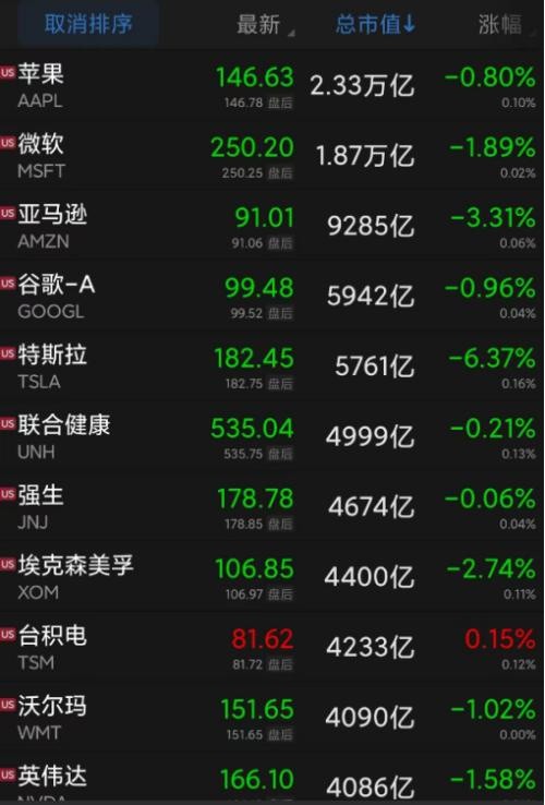 盘面上看,道指 30 只成份股中,仅波音录得上涨。大型科技股普跌,特斯拉跌 6.37%,约 390 亿美元(折合人民币约 2700 亿元)市值蒸发,亚马逊跌 3.31%,微软、英伟达跌超 1%,脸书母公司 Meta 跌 0.86%,苹果跌 0.8%。