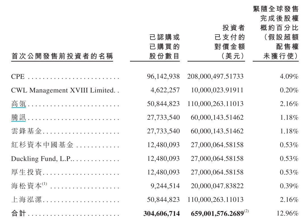 招股書顯示,首次公開發售前投資者名單包括 CPE 源峯、高瓴資本、紅杉中國、騰訊、雲鋒基金等一眾巨頭。