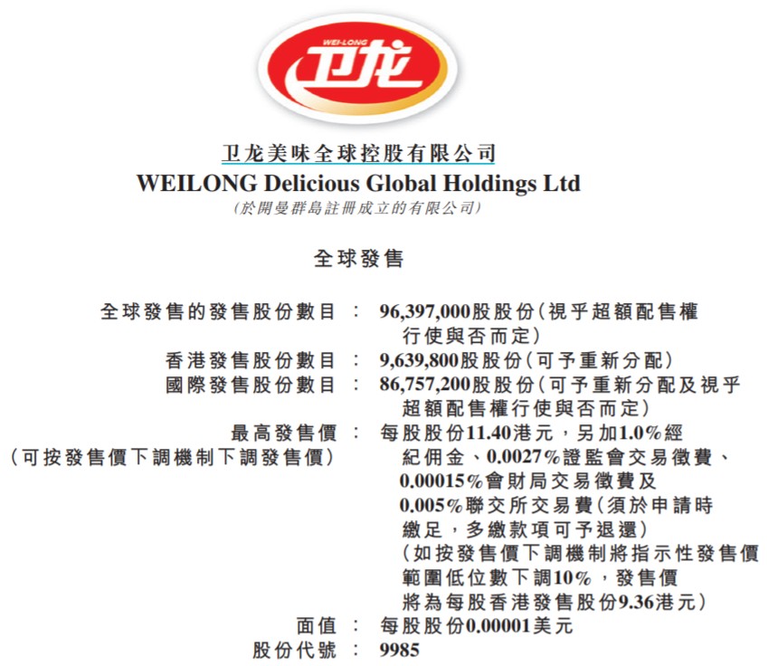 12 月 5 日,衞龍在港交所發佈公告稱,於 2022 年 12 月 5 日至 8 日招股,擬全球發售 9639.7 萬股股份,每股發售價為 10.4-11.4 港元,最高募資 11 億港元,公司市值約為 240 億港元,較上市前的估值幾乎打了 3 折。