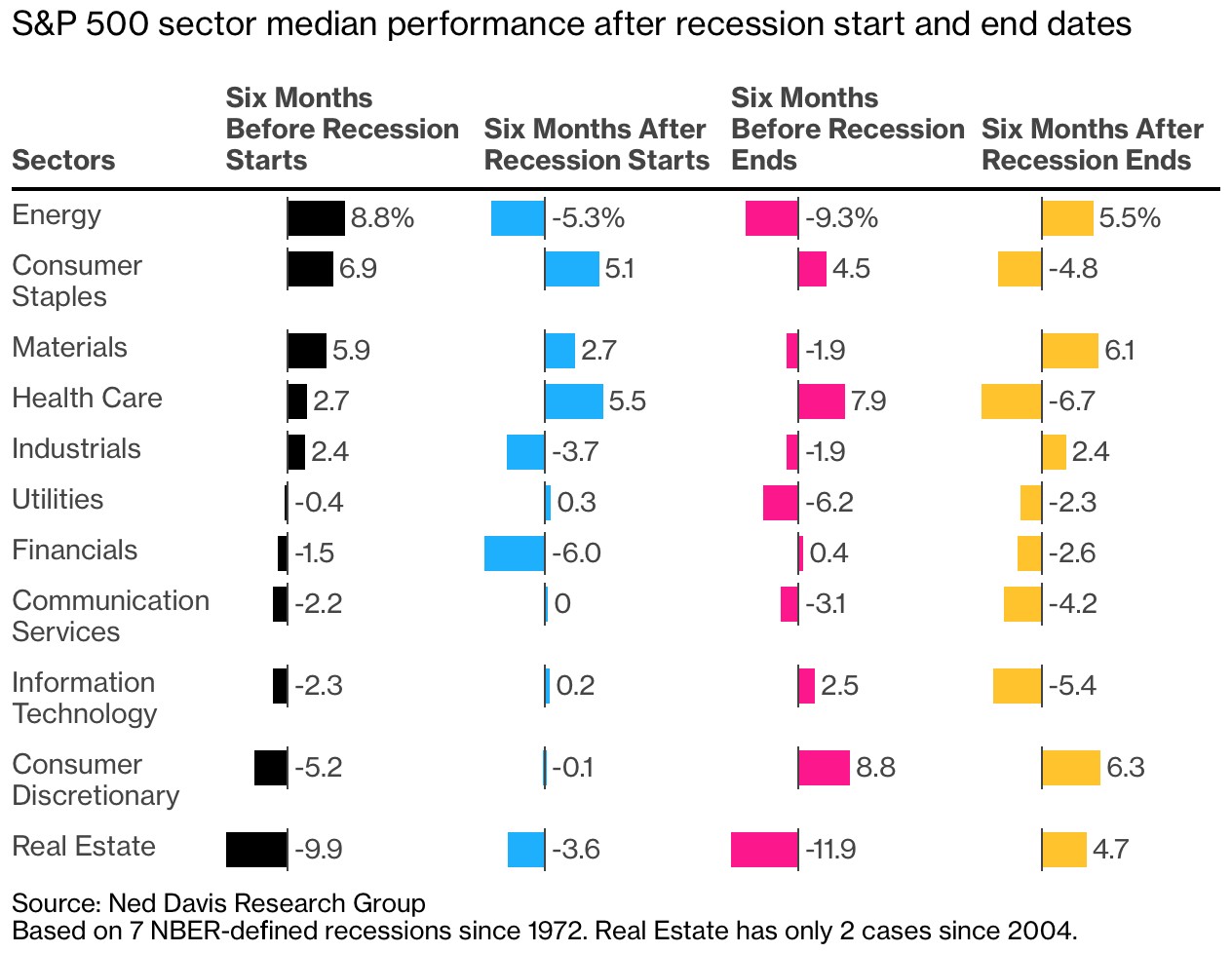 Ed Clissold 表示,不同行業歷史表現可以為進入低迷時期的投資方向提供指引。那些往往在經濟週期後期達到峯值的企業,如材料生產商和工業企業,通常在衰退前的六個月表現強勁。必需消費品和醫療保健類股也是如此。與此同時,金融、房地產和增長型科技等利率敏感行業的股票在此期間的表現往往會落後。