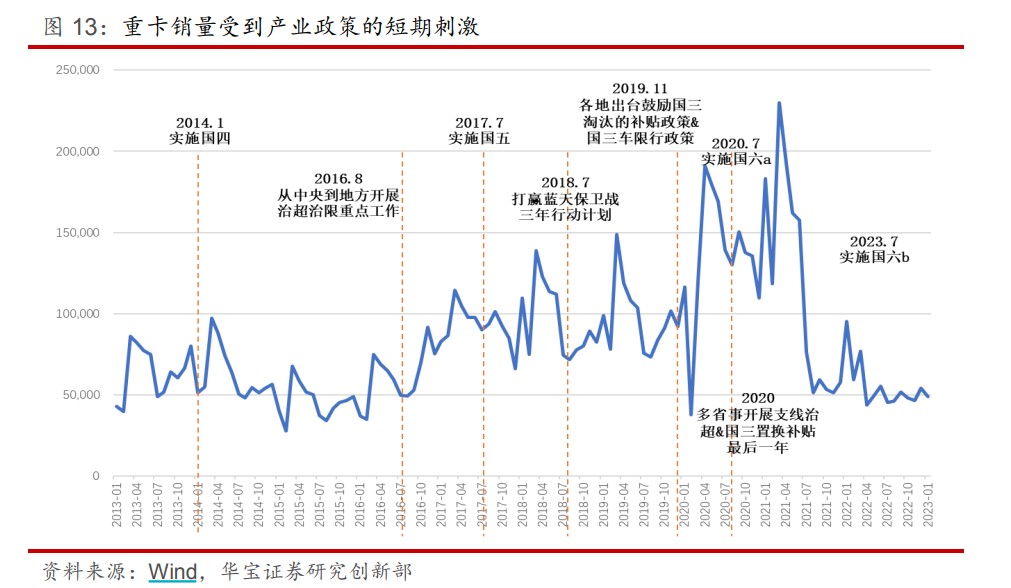 華寶證券分析稱,重卡銷量通常會受到產業政策的短期刺激,排放標準的升級或治超治限的執行往往會刺激銷量實現大增,這説明產業政策是影響重卡銷量波動的關鍵變量。
