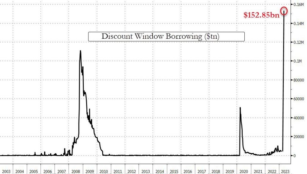 在截至 3 月 15 日的一週內,美聯儲最後一道流動性工具即貼現窗口下的借款激增至 1528.5 億美元創下歷史新高,高於前一週的 45.8 億美元,甚至超越了 2008 年金融危機期間創下的單週 1480 億美元的最高紀錄。