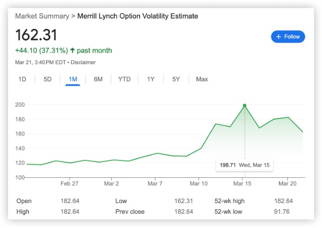 美債期權的加權隱含波動率 MOVE Index 在 3 月 15 日一度飆升至 200 附近的高點,説明當前美債市場缺乏流動性,美債收益率暴漲暴跌。