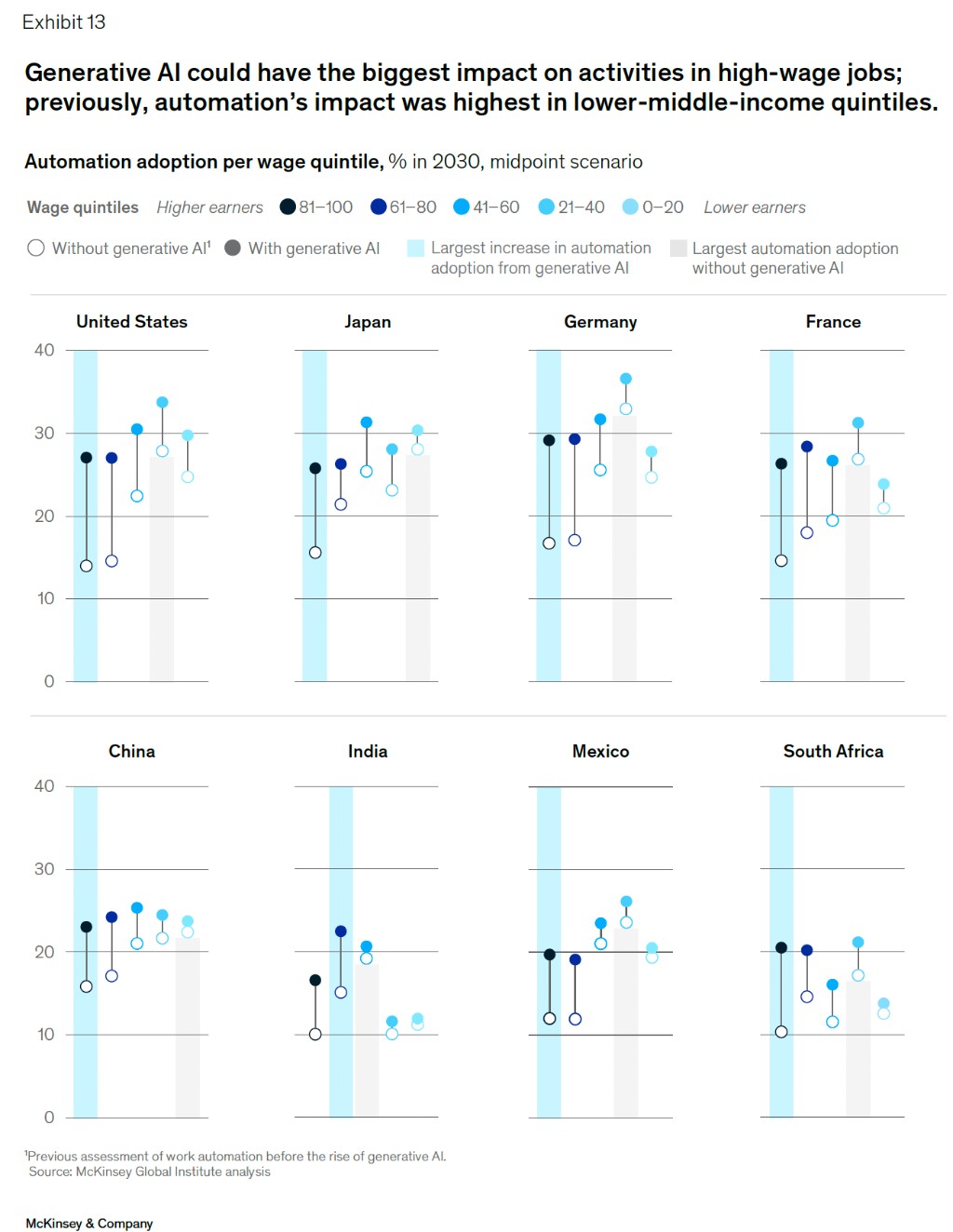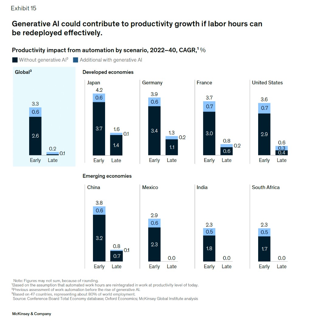 麥肯錫總結稱,全球出生率的下滑及人口老齡化將成為全球生產力發展的阻礙,而 AI 和其他科技的發展可以彌補就業人口下滑的問題,使生產力大幅提高,並使全球經濟提速,而發達國家採用 AI 的速度也可能更快: